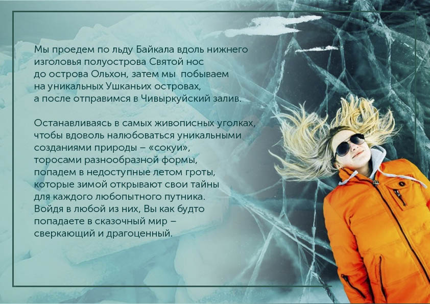 Мы проедем по льду Байкала вдоль нижнего изголовья полуострова Святой нос до острова Ольхон, затем мы побываем на уникальных Ушканьих островах, а после отправимся в Чивыркуйский залив. Останавливаясь в самых живописных уголках, чтобы вдоволь налюбоваться уникальными созданиями природы – «сокуи», торосами разнообразной формы, попадем в недоступные летом гроты, которые зимой открывают свои тайны для каждого любопытного путника. Войдя в любой из них, Вы как будто попадаете в сказочный мир – сверкающий и драгоценный.
