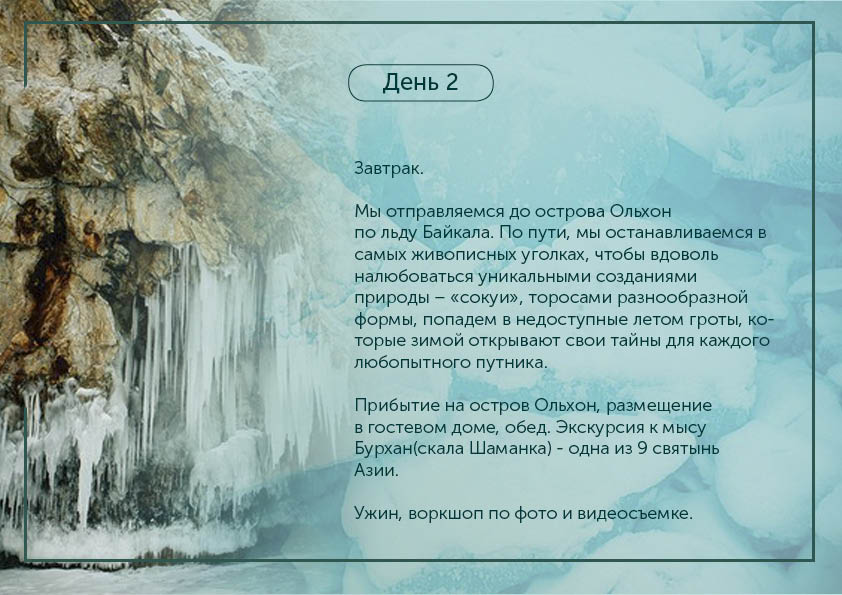 Завтрак. Мы отправляемся до острова Ольхон по льду Байкала. По пути, мы останавливаемся в самых живописных уголках, чтобы вдоволь налюбоваться уникальными созданиями природы – «сокуи», торосами разнообразной формы, попадем в недоступные летом гроты, которые зимой открывают свои тайны для каждого любопытного путника.