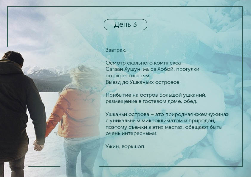 Ушканьи острова – это природная «жемчужина» с уникальным микроклиматом и природой, поэтому съемки в этих местах, обещают быть очень интересными. Ужин, воркшоп.