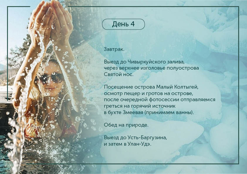 Завтрак. Выезд до Чивыркуйского залива, через верхнее изголовье полуострова Святой нос. Посещение острова Малый Колтыгей, осмотр пещер и гротов на острове, после очередной фотосессии отправляемся греться на горячий источник в бухте Змеевая(принимаем ванны). Обед на природе.