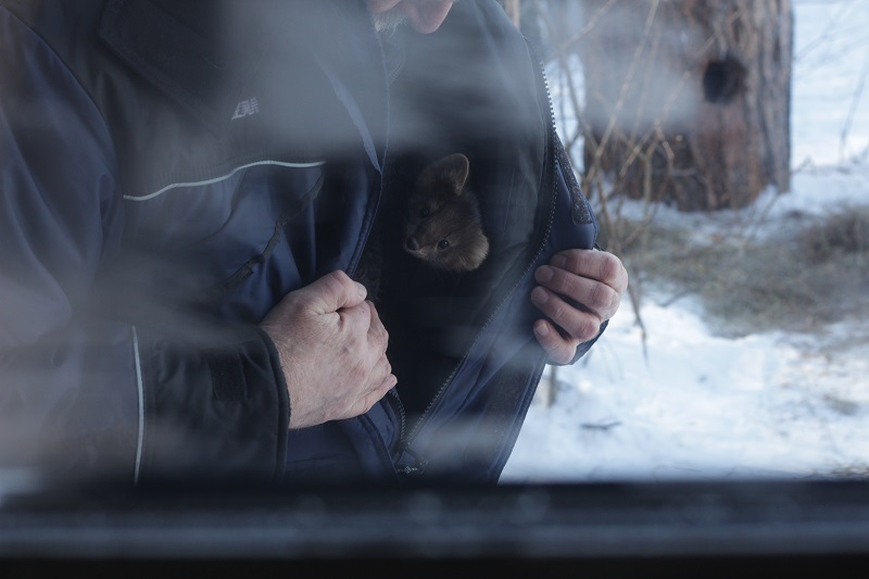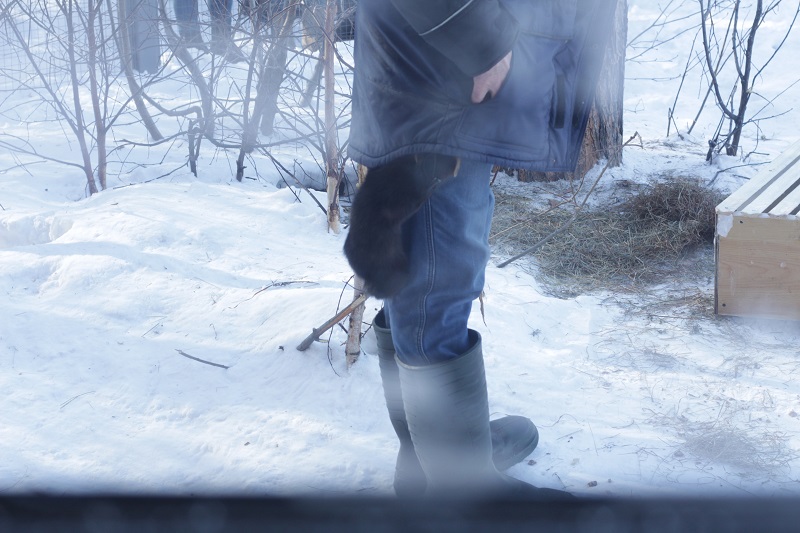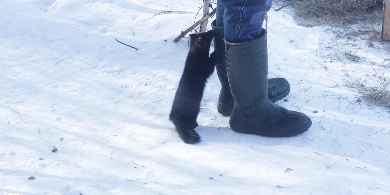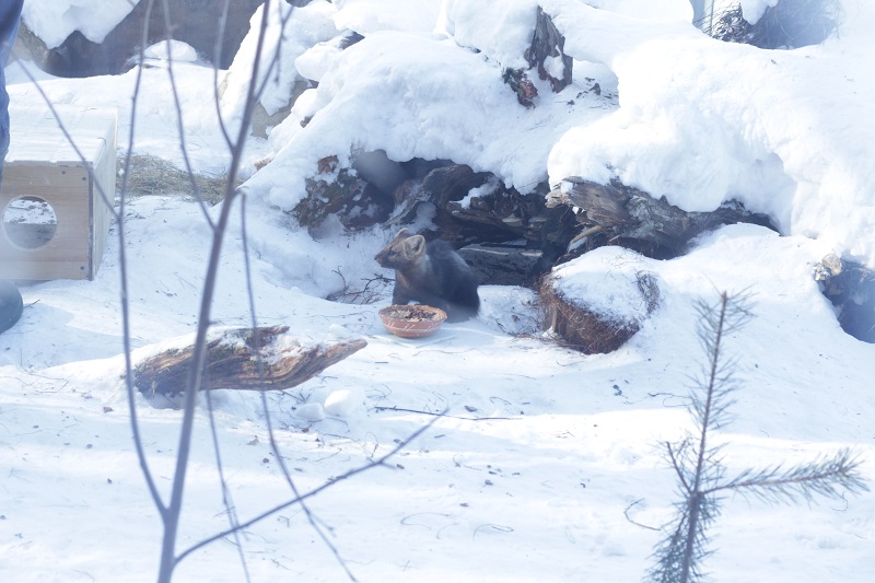 Сразу на входе внимание привлек вольер с соболями. У зверьков был время кормежки, но шустрые зверьки, отвлекаясь от пищи, резвились, забирались по штанине под куртку смотрителя и выскакивали из рукава, свешиваясь вниз головой.
